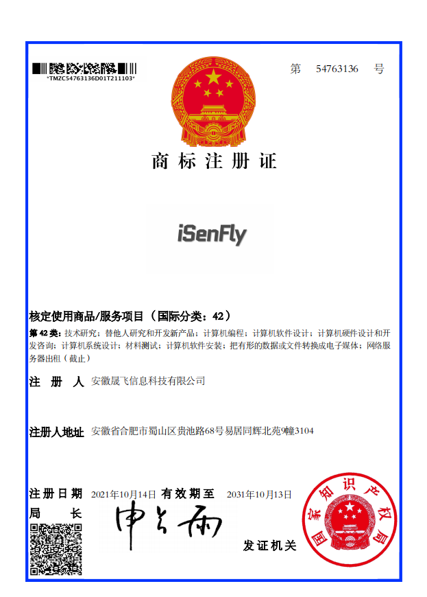 祝贺公司确定首版中英文“晟飞信息”、“iSenFly”二项商标,请已通过注册商标受理。